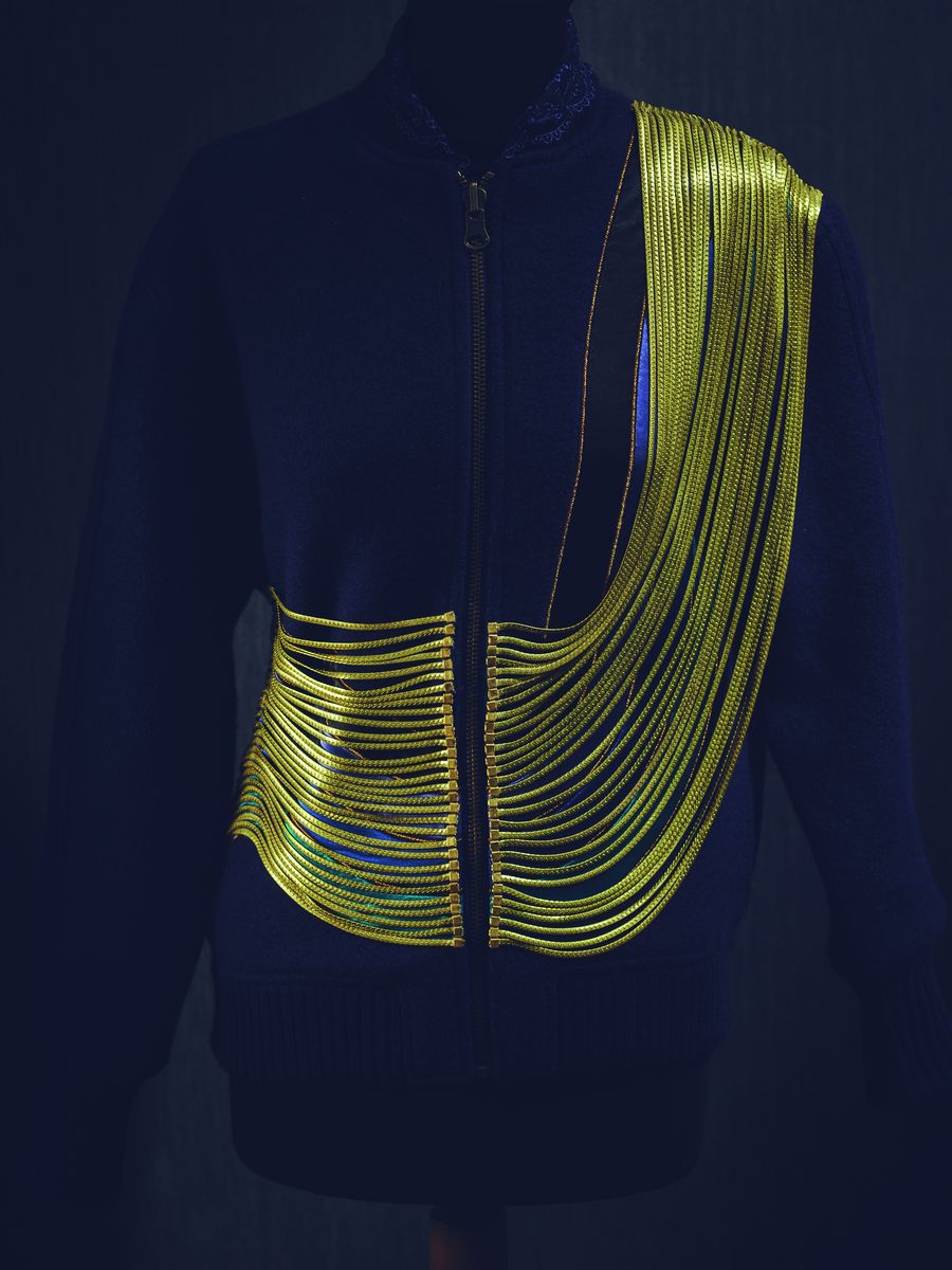 Blouson en laine bouillie, soie, dentelle & cascade de chaînes – pièce unique