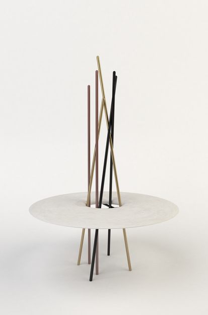 Table plateau circulaire, acier, laiton, cuivre, plâtre – Pièce unique