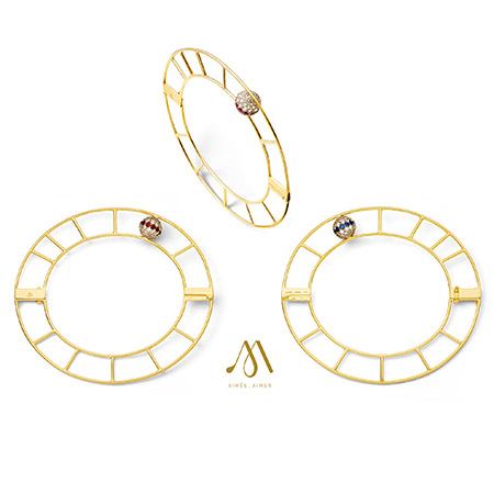 ‘Stirred by the simplicity of an ellipse, we sought to play with its qualities and restrictions. We looked at the purity of its shape and we wanted it to be worn vertically as a jewelry piece. A precious bracelet that is feminine and pure. It plays with our perspective by contrasting the proportions of the ellipse shaped bracelet and the gold sphere. This piece, carefully crafted by French artisans, holds a gold sphere with a paved setting of diamonds, sapphires and rubies in a fun representation of the American flag.’